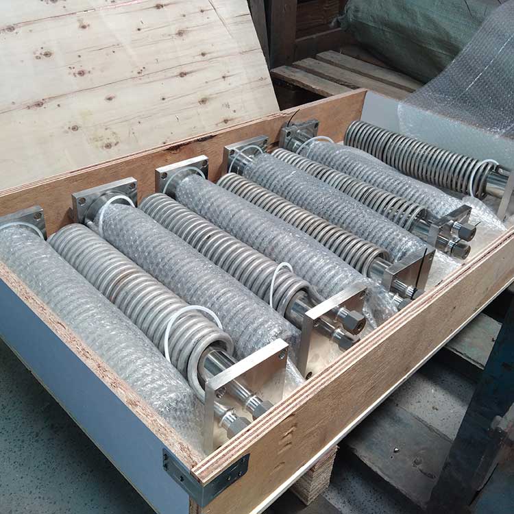 冷卻器由內螺旋管、外螺旋管組成。共同安裝在一個筒體內。外螺旋管在呈螺旋運行的冷卻水中進行熱交換;內螺旋管在呈渦流運動的冷卻水中進行熱交換,兩種冷卻水巧妙地匹配在一只冷卻器中進行流動。